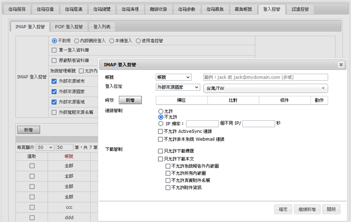 硬體安裝規格: 本軟體僅支援安裝於 ArmorX OS 作業系統應用, 搭配之硬體設備需提供標準 Linux OS(64bit) 驅動,亦可安裝於 VMWare 6.0 以上系統。 中央處理器:8 核以上 記憶體:32GB 以上 軟體規格: 一、 帳號管理 1. 帳號整合支援 LDAP/AD、SQL、檔案匯入匯出、RADIUS、TACACS+、SOAP API。 2. LDAP 整合 支援多台 AD 同步階層式、組織群組 OU 與安全性群組 Group、各種欄位與轉向認證。 二、 信箱服務 1. 信箱容量:可依照帳號或群組設定信箱容量;當信箱容量屆滿 N%,可發送通知信提醒使用者與管理者;當信箱容量屆滿 N 天,可設定禁止登入讀信、刪除帳號、N 天後刪除帳號;當信箱容量屆滿 N 天,可設定禁止寄信。 2. 信箱屆滿:提供當信箱屆滿時的適當處理機制,包含:禁止寄信、禁止讀信與信箱登入服務、刪除帳號。 3. 信箱總覽:包含使用量、使用比例、剩餘空間、最近使用時間、登入 IP、使用服務,可由管理者設定信箱收信匣代理人。 6. 為避免電子郵件系統遭滲透,提供 POP/IMAP 讀信控管,可依照帳號、群組、帳號主機名稱、全部;登入位址:完整來源 IP、寬鬆來源 IP、外部來源 IP、外部來源城市、外部來源國家、外部來源區域、外部來源寬鬆名稱、外部無來源名稱、內部來源 IP、本機登入、全部;設定連線管制:允許、不允許;下載管制:只允許下載標題、只允許下載本文 (不允許系統報告外內嵌圖、不允許所有內嵌圖、不允許真實附件名稱、不允許附件資訊)。 7. 提供讀信日誌並可自訂排程報表,以及將已讀時間提供給使用者,顯示於寄件備份匣。 8. 為避免 IMAP 或 POP 讀信密碼被猜中,可設定 IMAP 或 POP 認證失敗頻率超過 N 次/N 秒,將外部 IP 加入防火牆。 三、 Web Mail 1. 系統登入安全性支援虛擬鍵盤、圖片驗證、APP OTP 安全金鑰。 2. 自訂登入頁面,包含多種樣式、客製背景、客製登入視窗、字體大小、字型、登入視窗標題、登入視窗樣式、商標位置、公司資訊位置。 3. 自訂 Web Mail 主頁面。 4. 電子郵件 (1) 讀信:須支援郵件預覽 (上下或左右)、鍵盤 Shift 多選+Ctrl 單選、滑鼠右鍵選單 (包含郵件規則)、樹狀收信匣、滑鼠右鍵新增資料夾、IMAP Thread 郵件串、簡繁體轉換、預覽 Word 文件/Excel 試算表/PowerPoint 簡報附件。 (2) 寫信:須支援多個寄件者身份與 HTML 簽名檔 (支援內嵌圖) 和 LDAP 公用通訊錄 vCard 名片、收件者隨打即找 (至少 15 筆)、從 Word 或 Excel複製與貼上表格需保留原來的框線顏色與背景顏色、HTML5 多檔拖放上傳、簡繁體轉換、預約寄信、收件者自動加入通訊錄、群發單顯 (多位收件者每位只看到自己)、主旨/內容置換 (參數須包含收件者顯示信箱、收件者帳號、收件者信箱)、內部禁止轉寄 (可設定允許名單)。 四、 郵件服務 1. 為降低駭客跳板濫發、中毒通訊錄濫發與內部假冒發信的災難,可設定寄件者帳號必須是 SMTP 認證帳號、使用者帳號、使用者化名、所屬群組化名。 2. 避免遭駭客跳板濫發,提供 SMTP 登入控管。 3. 為避免異常大量發信造成系統雍塞,可區分內送、外寄與所有,依照帳號、群組與網域,設定年、月、日、時、分與秒寄信次數累計、收件者人數與收件者人數累計寄信大小、寄信總量、寄信大小累計與寄信總量累計 (總量等於大小乘以收件者人數)上限,超過可執行通知管理者、延遲傳送與拒絕傳送。 4. 寄件者網域控管:對來自內部 IP、代轉 IP 或通過認證的外部 IP 的寄件者信箱主機或來源 IP,執行允許、允許內部 IP、拒絕、拒絕外部網域、拒絕代轉、排除的控管。 五、 智慧型行動裝置 1. 郵件 (1) 讀信 (2) 寫信 2. 通訊錄 (1) 讀取 (2) 聯絡人資訊 (3) 搜尋 (4) 新增、編輯、刪除個人通訊錄聯絡人 3. 行事曆 (1) 讀取 (2) 活動詳細資料 (3) 新增、編輯或刪除行事曆活動 4. 其他 (1) 權限管理 (2) 郵件、行事曆、附件預覽:可自訂浮水印 (3) 管理者可查看使用者登入記錄,包含帳號、登入時間、來源位址、來源國碼/國名/電信商、作業系統、版本、裝置名稱。 |