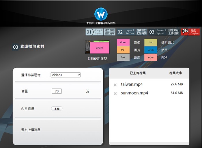 • 提供直覺式的簡易操作介面,讓非技術使用者也能輕鬆上傳文字、圖片、影片及設定即時訊息內容。 • 可自由排定內容播放的日期。 • 可排定不同時間段播放不同內容,例如早上顯示內部公告,下午顯示宣導影片,晚上播放外部活動資訊。 • 即時訊息可獨立於畫面底部滾動,內容自動更新無需重啟。 • 系統內建支援顯示「發電量資訊」、「六都天氣資訊」、「空氣品質資訊」等公開資料來源,可設定更新頻率並自動顯示於指定區域。 |