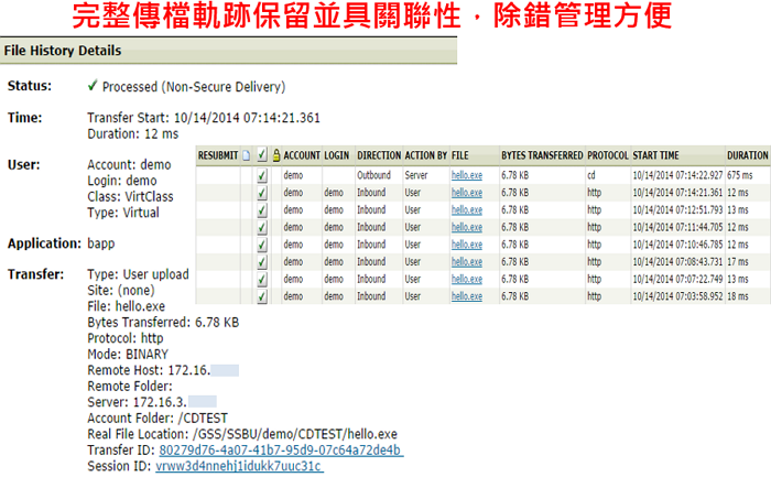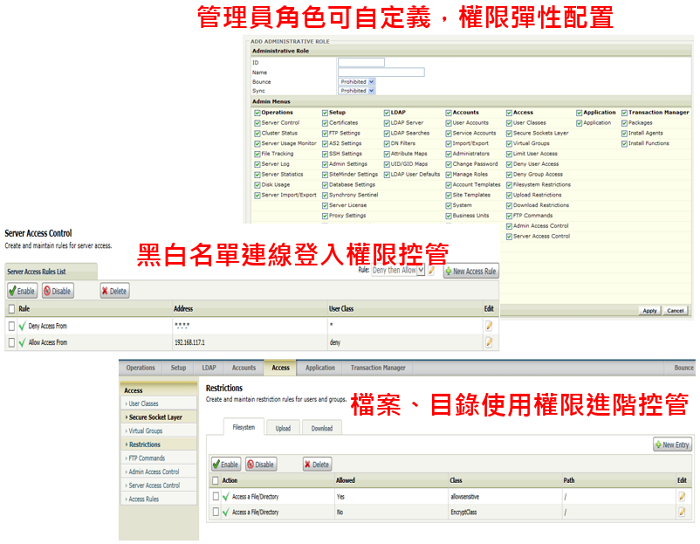 PGP檔案加/解密:檔案到位自動PGP加密、解密。 DMZ區單向Port:防火牆僅需開放內對外單方向Port,加強網路防護。 DMZ區檔案不落地:傳輸過程中,DMZ Server主機不落地任何實體檔案。 上傳/下載控管:管制檔案上傳/下載,限制某些群組帳號僅能上傳或是下載檔案。 支援H/A架構:平台本身提供A/A、A/S叢集架構。 Ad-hoc功能:將檔案轉化成下載連結,並寄出E-Mail給收件者。可自訂義連結有效時間,與檔案下載限制。 分權委任管理:自訂權限群組,委任不同管理帳號,各自管理不同對象。例如: 新增管理帳號Admin A並授予查詢權限,僅能查詢Group A之傳檔紀錄,無法查詢Group B之傳檔紀錄。 ICAP協定支援:提供Antivirus、DLP軟體整合之可能。 REST API(管理者):提供REST API供管理者、使用者使用。 傳輸流量限制:可依群組、帳號,限制個別帳號不同檔案上傳/下載流量限制。 |